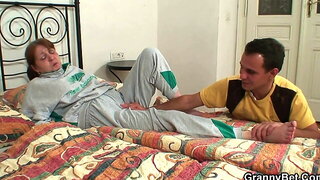 flagOld slut works cock alongside her granny in very sexy home threesome